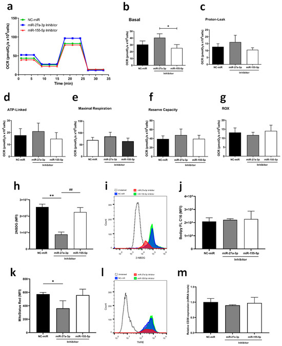 Inhibition of miR-27a-3p and miR-155-5p leads to changes in metabolic uptake and mitochondrial functionality. (a) Representative oxygen consumption rates (OCRs) measured by HRR. (b–g) Respiratory parameters assessed by HRR: Basal oxygen consumption (Basal); Oxygen consumption uncoupled to ATP synthesis (Proton Leak); Oxygen consumption coupled to ATP synthesis (ATP Linked); Maximum oxygen consumption (MAX); Reserve respiratory capacity (Reserve); Residual oxygen consumption (ROX). (h,i) Histogram and fluorescence intensities representing 2-NBDG uptake. (j) Green fluorescent fatty acid uptake, BODIPY FL C16. (k,l) Quantification of inner mitochondrial membrane depolarization levels by MitoStatus Red (TMRE) fluorescence assessed by flow cytometry in cells transfected with A172 and histogram representation; (m) fatty acid marker gene (CD36) expression in A172 cells assessed by RT-qPCR assay after transfection. miR-NC as negative control. Data are presented as mean ± SD of 3 independent experiments analyzed by ANOVA with post hoc Tukey correction. * p < 0.05, ** p < 0.01 vs. NC-miR, and ## p < 0.01 vs. miR-27a-3p inhibitor.