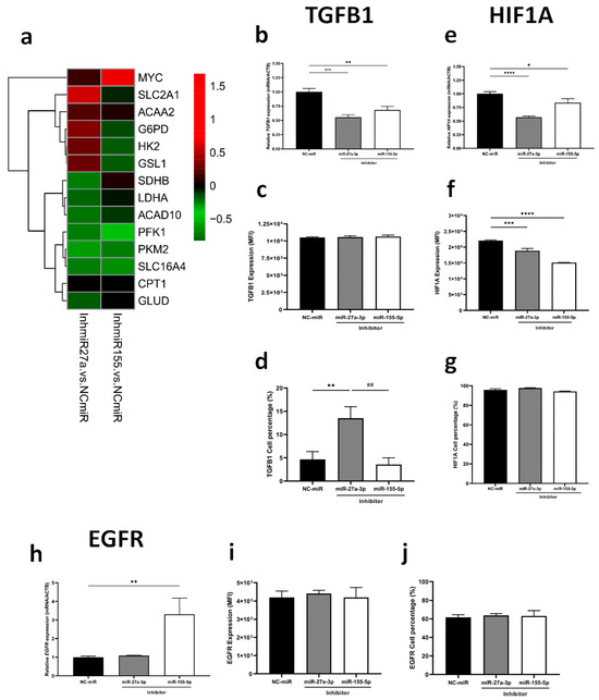 Inhibition of miRNAs modulates the expression of metabolic genes and affects gene and protein expression of key targets of tumorigenesis. (a) Heatmaps of relative expressions of metabolic genes assessed by RT-qPCR. (b–d) TGBF1, (e–g) HIF1A, and (h–j) EGFR gene and protein expression by RT-qPCR and flow cytometry, respectively. miR-NC as negative control. Data are presented as mean ± SD of 3 independent experiments. * p < 0.05, ** p < 0.01, *** p < 0.001, **** p < 0.0001 vs. NC-miR, and ## p < 0.01 vs. miR-27a-3p inhibitor.