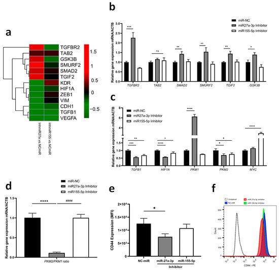 TGF-β signaling genes as targets of miR-27a-3p and miR-155-5p (a) Heatmap with qRT-PCR analysis was performed to determine the effects of inhibition on the predicted targets of TGF-β signaling, epithelial–mesenchymal transition, and angiogenesis. (b) Relative expression of shared target genes among study miRNAs after inhibition. (c) Relative expression of gene targets related to the functional duality of TGF-β. (d) Gene expression ratio of PKM isoforms. (e,f) Fluorescence intensities and representative histogram of CD44 protein expression. miR-NC as negative control. Data are presented as mean ± SD of 3 independent experiments. ns, not significant; * p < 0.05, ** p < 0.01, *** p < 0.001, **** p < 0.0001 vs. NC-miR, and #### p < 0.001 vs. miR-27a-3p inhibitor.