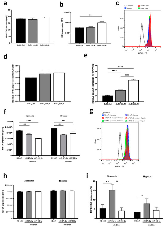Inhibition of miR-27a-3p affects HIF1A expression under hypoxia and reduces TGF-β positive population. (a–e) Characterization of the gene and protein expression profile of HIF1A and the VEGFA gene under hypoxia induction protocol with CoCl2. (f,g) Protein expression by flow cytometry of HIF1A under normoxic and hypoxic conditions by induction with CoCl2. (h,i) Protein expression by flow cytometry of TGFB1 under normoxic and hypoxic conditions by induction with CoCl2. miR: microRNA. NC-miR: negative control. * p < 0.05, ** p < 0.01, *** p < 0.001, **** p < 0.0001 vs. NC-miR; ## p < 0.01 vs. miR-27a-3p inhibitor and #### p < 0.001 vs. CoCl2 100 µM.