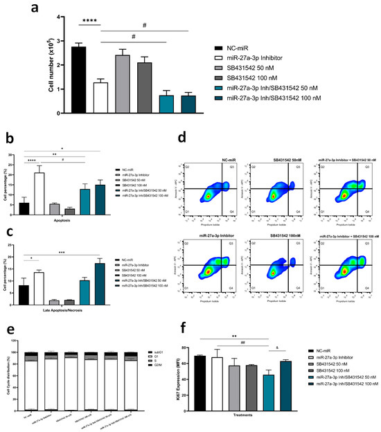 Co-treatment with specific TGF-β inhibitor and miR-27a-3p inhibitor further reduces cell viability. (a) Cell viability assessed by cell counts determined by staining with 0.4% trypan blue after inhibition of miR-27a-3p, SB431542 (50 and 100 nM) and inhibitor co-treatment. (b–d) Flow cytometry assay in A172 cells after treatment with miRNA and TGF-β inhibitors to quantify the ratio of apoptosis and late apoptosis/necrosis, with representative graphs of flow cytometry analysis for cell death. (e) Representative bar graphs of cell cycle progression by flow cytometry analysis for cells. (f) Proliferation rates measured by MFI for Ki-67. Data are presented as mean ± SD of 3 independent experiments. miR: microRNA. NC-miR: negative control. * p < 0.05, ** p < 0.01, *** p < 0.001, and **** p < 0.0001 vs. NC-miR; # p < 0.05, ## p< 0.01 vs. miR-27a-3p inhibitor, and & p < 0.05 vs. miR-27a-3p Inh/SB431542 50 nM.