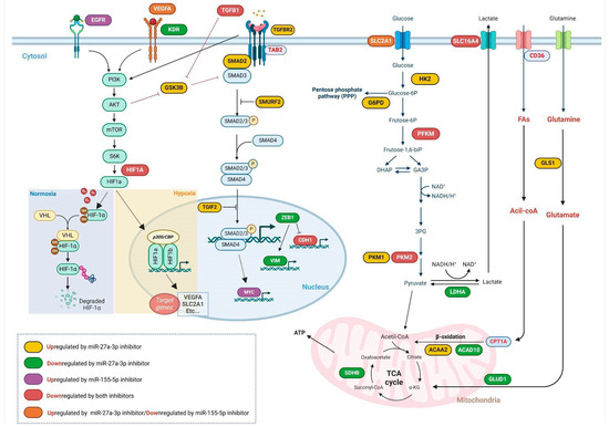Modulation of gene expression following miR-27a-3p and/or miR-155-5p inhibition. This diagram provides a comprehensive overview of how different signaling and metabolic pathways are regulated within tumor cells, highlighting the influence of specific microRNA inhibitors such as miR-27a-3p and miR-155-5p under diverse conditions, illustrating the regulation of important receptors, such as EGFR and VEGFA, and crucial signaling pathways, including PI3K/AKT/mTOR and TGF-β, and their partners, as well as key metabolic pathways. Created in Biorender. Weber, A.F. (2025) https://app.biorender.com/t-68bd7d389179ec9ed84c16f8 (accessed on 4 September 2025). The figure was created with BioRender.com.
