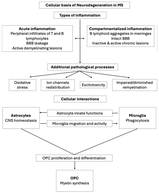 Neuroinflammation is a complex process involving the coordinated activity of glial cells. When myelin sheaths are destroyed and accumulated in the extracellular space, microglia are activated and recruited to clean the debris, and primary neuroinflammation advances. Reactive astrocytes are induced by these activated microglia-secreted cytokines [35], and they participate in myelin debris removal [36,38] and the recruitment of more microglia into the lesion [35]. As different stages of neuroinflammation have been described, glial cells modulate their phenotype along this process from amplifying and propagating inflammatory signals to modulate inflammation by intercellular communication and feedback, which confers the pro- and anti-inflammatory aspects of neuroinflammation [39]. It should be mentioned that this inflammatory process is also fueled by the infiltration of peripheral immune cells in the CNS and the increased levels of pro-inflammatory cytokines [40]. The contribution of B and T lymphocytes to the neuroinflammation and pathology of MS has been widely reviewed. Several B cell subsets might act as antigen-presenting cells and pro-inflammatory cytokine-producing cells, while other subsets might present an anti-inflammatory regulatory action [27]. Different types of T cells, such as effector T cells and regulatory T cells, are involved in the development and progression of MS [41]