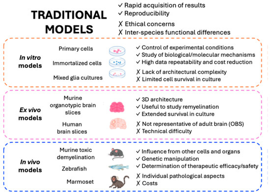 Traditional experimental models for studying neurorepair in MS. General advantages and limitations of traditional models. Different alternative models and their specific advantages and limitations are presented. A tick (✓) indicates advantages; a cross (✗) indicates limitations. OBSs: organotypic brains slices. Figure created using Canva (www.canva.com (accessed on 17 July 2025)).
