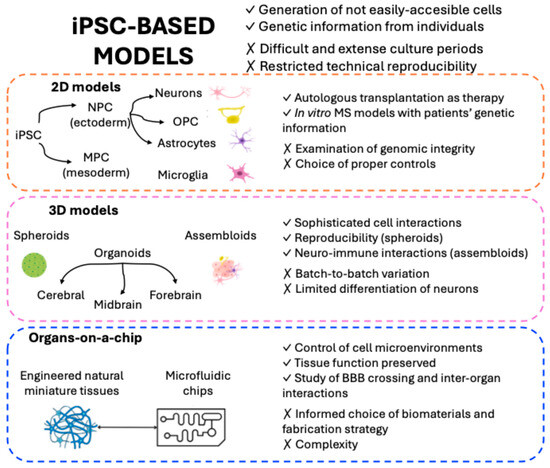 Initially, a favorable option was to differentiate iPSCs into simple 2D culture, but the recent development of complex tridimensional (3D) models offers the opportunity to explore more sophisticated cellular interactions [179] and test therapeutic options on models that more accurately replicate in vivo conditions [147]. Among these 3D models, spheroids, organoids and assembloids have demonstrated their potential for studying neurological diseases including MS [23].