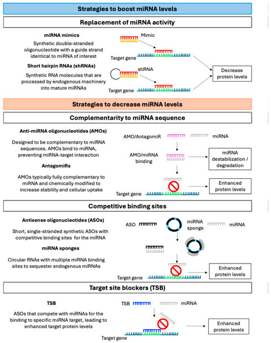 To repress the function of an miRNA that is overexpressed, different approaches might be implemented. Firstly, anti-miRNA oligonucleotides (AMOs) are synthetic oligonucleotides designed to be complementary to miRNA sequences, hybridizing with them to form a duplex. This binding prevents the miRNA from interacting with its mRNA targets and, in some cases, may lead to destabilization or degradation of the miRNA [53]. AntagomiRs are a specific type of AMO, typically fully complementary to the miRNA and chemically modified to increase stability and cellular uptake [224]. Secondly, the introduction of competitive binding sites for the miRNA might also repress miRNA function. These binding sites can be designed as short, single-stranded synthetic antisense oligonucleotides (ASOs) [221] or as miRNA sponges, such as circular RNAs, which contain multiple miRNA binding sites to sequester endogenous miRNAs [222]. Thirdly, target-site blockers (TSBs) are ASOs that specifically compete with miRNAs for the binding to specific mRNA of an miRNA target, preventing them from binding to those sites and ultimately leading to enhanced target protein levels of that specific target [225]. For example, arginase-2 can be protected from miR-155 action using TSBs, enhancing anti-inflammatory characteristics in macrophages