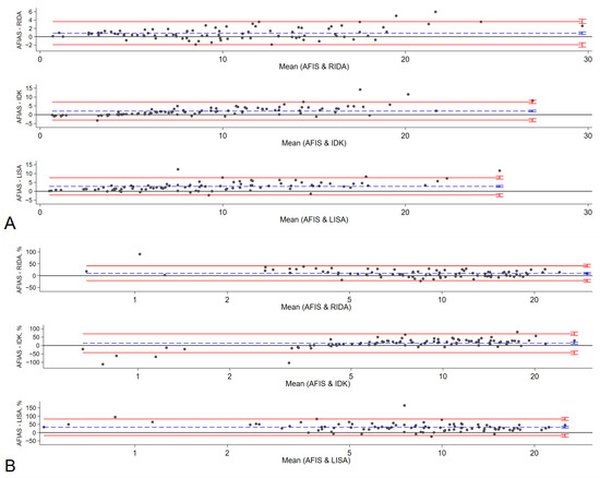Bland–Altman Chart. Bland–Altman analysis verified the difference in ADL measurements among RIDA, IDK, LISA, and AFIAS (A). Percentage differences between AFIAS and RIDA, IDK, and LISA are shown in (B). The difference between the two measurements (A) and the percentage difference (B) are plotted on the y-axis, and the average of the two measurements is plotted on the x-axis. Blue lines represent the bias, and red lines represent the 95% limit of agreement (LOA) for each comparison. Small vertical bars at the end of each line represent 95% confidence intervals. AFIAS—AFIAS Adalimumab; IDK—IDKmonitor® Adalimumab Drug Level; LISA—LISA-TRACKER Duo Adalimumab; RIDA—RIDASCREEN® ADM monitoring.