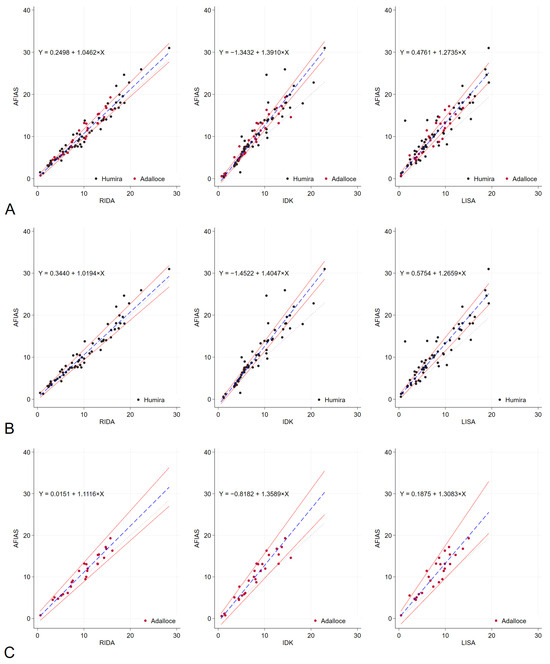 Passing–Bablok regression analysis results. Passing–Bablok regression analysis was conducted to compare the performance of RIDA, IDK, LISA, and AFIAS with regard to the measurement of adalimumab levels across all patients (A). Additionally, the analysis was stratified based on the type of adalimumab administered, either the original Humira® (B) or the generic Adalloce® (C). The dotted lines represent the reference line (y = x), whereas the solid red lines indicate 95% confidence bounds. The blue dashed lines illustrate the Passing–Bablok regression lines. The regression formula is shown in the upper left corner of each plot. (A): For all patients, (B): original adalimumab (Humira®) and (C): generic adalimumab (Adalloce®). AFIAS—AFIAS Adalimumab; IDK—IDKmonitor® Adalimumab Drug Level; LISA—LISA-TRACKER Duo Adalimumab; RIDA—RIDASCREEN® ADM Monitoring.