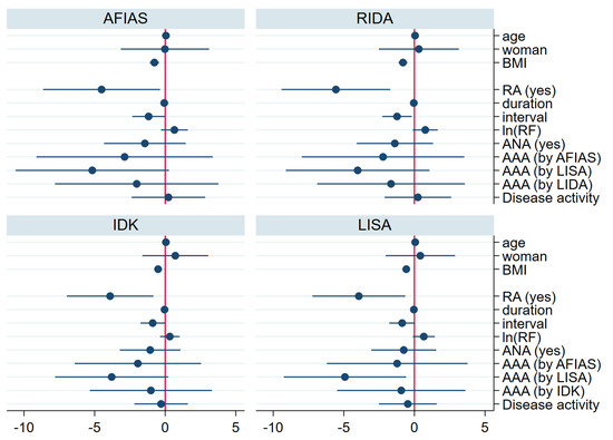 Regression coefficient for drug concentration by each kit (multivariate analysis). In the multivariate regression analysis for the drug concentration, higher BMI, prolonged injection interval, and diagnosis of RA were associated with low trough drug concentration. AAA—anti-drug antibody; ANA—antinuclear antibody; BMI—body mass index; duration—years from the first adalimumab injection to the day of enrollment; interval—interval between adalimumab injections; ln(RF)—log natural function of quantification of rheumatoid factor; RA—rheumatoid arthritis; AFIAS—AFIAS Adalimumab or AFIAS Free Anti-Adalimumab; IDK—IDKmonitor® Adalimumab Drug Level or IDKmonitor® Adalimumab Free ADA; LISA—LISA-TRACKER Duo Adalimumab; RIDA—RIDASCREEN® ADM Monitoring.