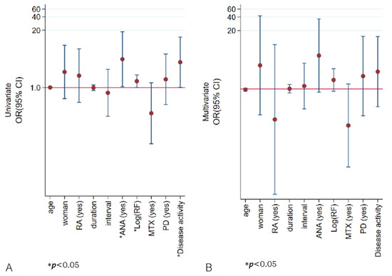 Patients with AAA positivity were more likely to have ANAs and increased disease activity, showing a trend for increased ESR and higher RF. In the univariate analysis, ANA, RF, and disease activity were associated with AAA positivity, while multivariate analysis showed no significant factors (Table 6, Figure 4, Supplementary Table S5). In the application of backward elimination within multivariate logistic regression, ANA positivity remained a significant predictor of AAA positivity, with an odds ratio of 5.26 and a p-value of 0.039. Furthermore, female sex, a diagnosis of rheumatoid arthritis, higher RF value, ANA or AAA positivity, and a combined treatment involving prednisolone were related to disease activity in the univariate logistic analysis. However, in the multivariate analysis, no significant association was observed. (Supplementary Figure S3).