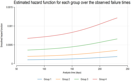 Estimated hazard function for each group over the observed failure times. Patients were categorized based on an ADA concentration threshold of 5 µg/mL and the presence of AAA into four groups: group 1 (high ADA, AAA−), group 2 (high ADA, AAA+), group 3 (low ADA, AAA−), and group 4 (low ADA, AAA+). Notably, patients in group 4, characterized by low ADA concentrations and positive AAA, were most frequently associated with ADA discontinuation during follow-up. AAA—anti-adalimumab antibody; ADA—adalimumab.