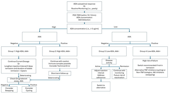 Flow diagram implementation of point-of-care measurement of ADA and AAA. AAA—anti-adalimumab antibody; ADA—adalimumab; POC—point of care; TDM—therapeutic drug monitoring; TNF—tumor necrosis factor; JAK—Janus kinase; Cycling—switching to other TNF inhibitors other than adalimumab; Swapping—switching to the other biologics or JAK other than TNF inhibitors.