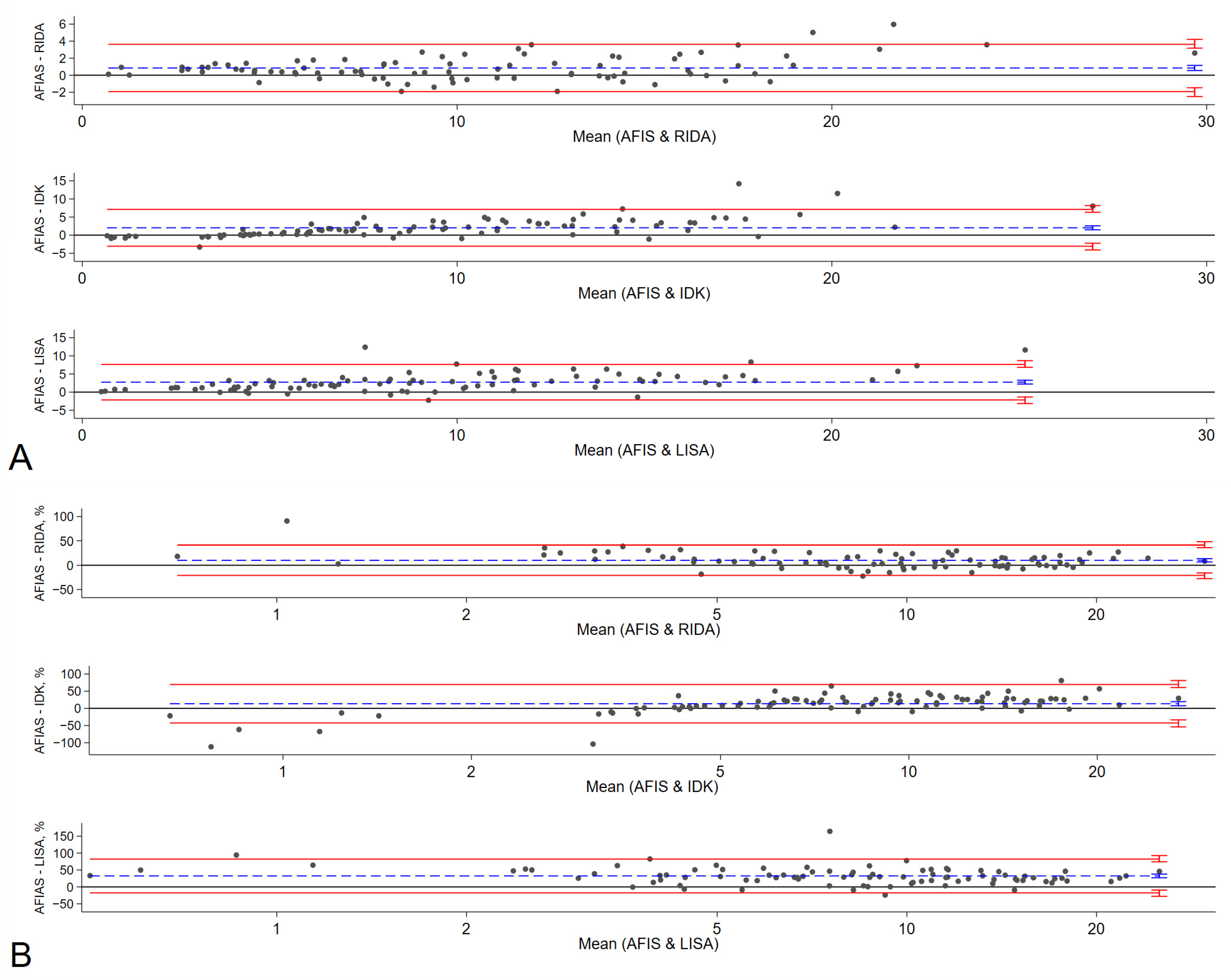 Supplementary Tables S1 and S2). To assess inter-operator variability and minimize potential bias, two trained laboratory technicians independently performed all AFIAS and ELISA measurements under standardized protocols. Inter-operator precision was analyzed by comparing replicate results (