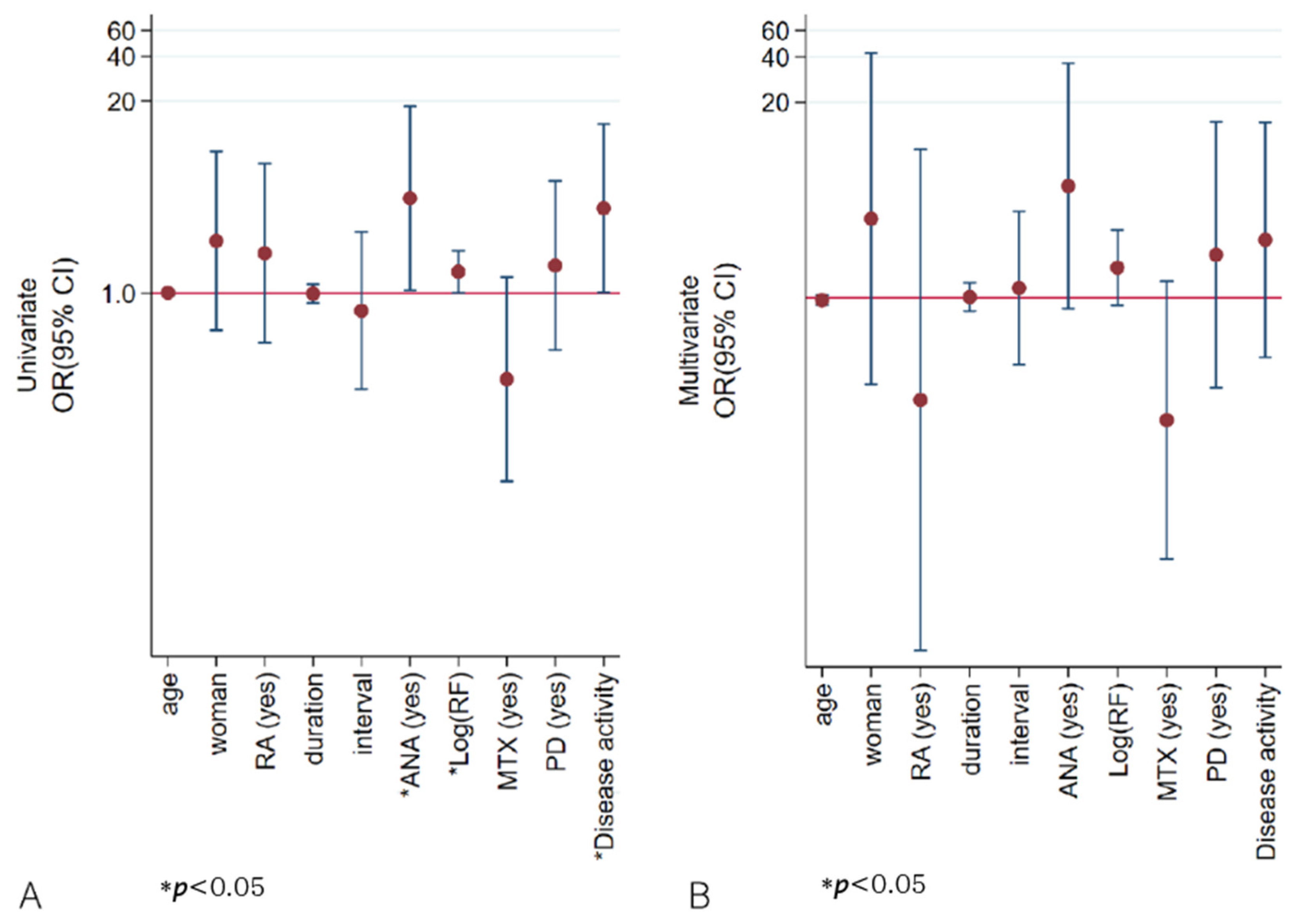 8]. In this study, positive ANA results were pre-tested in all patients and were not related to the use of TNF inhibitors. In univariate analysis, ANA was found to be associated with AAA development. However, this association was not evident in multivariate analysis, with a small margin of difference. This discrepancy may be attributed to the limited sample size of the patient cohort. These findings indicate that baseline ANA positivity is associated with AAA development, which is consistent with the findings of previous research. Indeed, previous studies have shown that patients with baseline ANAs and higher titers prior to commencing TNF inhibitors were more likely to develop anti-drug antibodies [