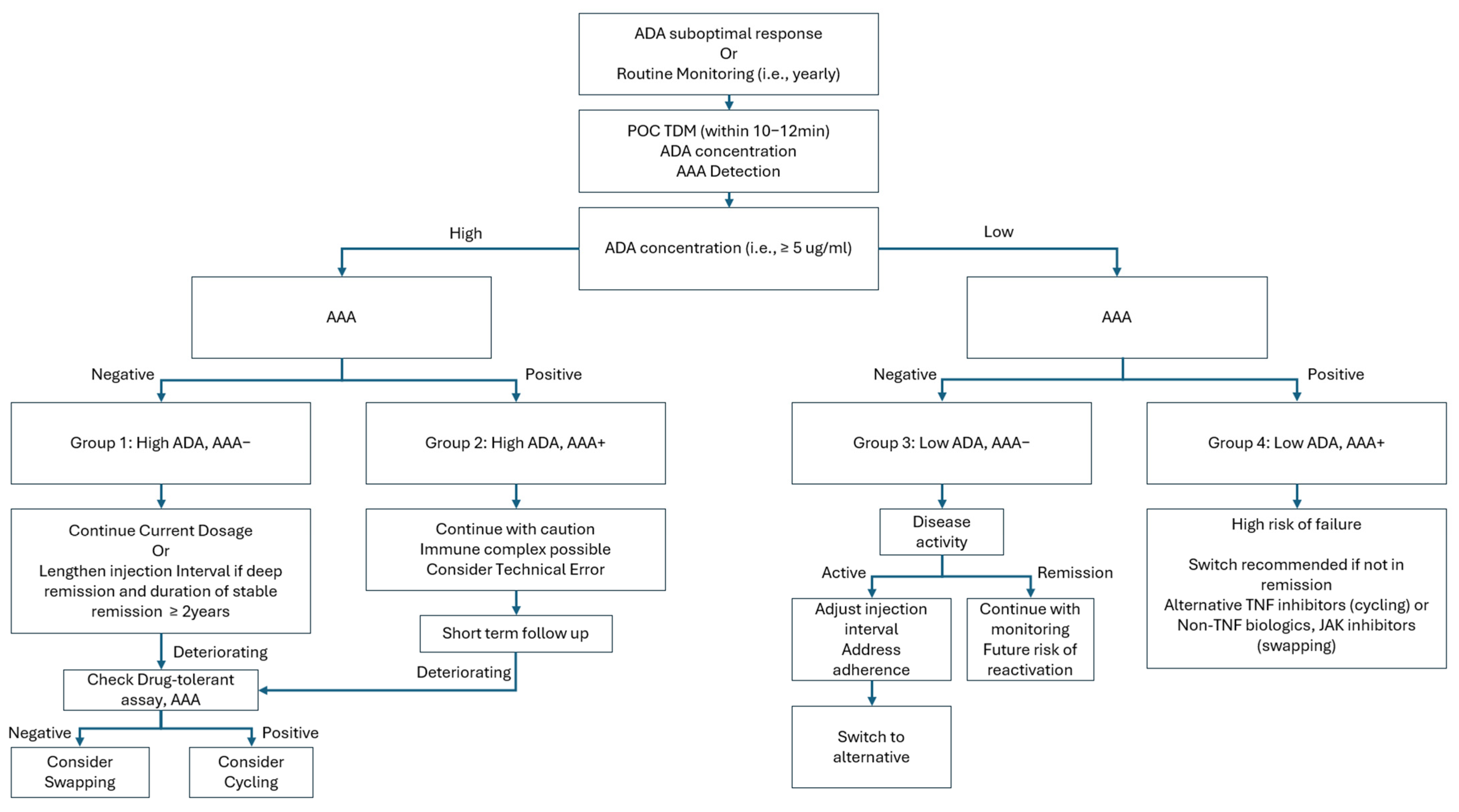 27]. Future integration with electronic health records and clinical decision support systems may further enhance the clinical utility of POC TDM platforms, supporting the development of personalized biologic therapy algorithms and advancing precision medicine in rheumatology practice.