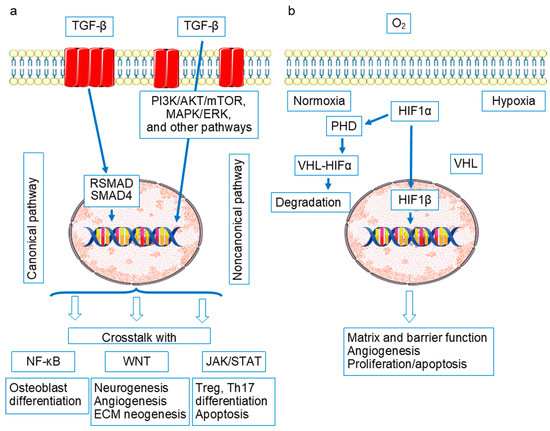 Schematic representation of the activation of signaling pathways and the influence on the pathogenesis of OA and RA. (a) Canonical and non-canonical activation of TGFβ signaling pathways. In canonical activation, 2 types of receptors form a hetero-tetrameric complex. Type I cell surface receptor phosphorylates intracellular receptor-regulated SMADS (R-SMADS), such as SMAD2 or SMAD3. The phosphorylated R-SMADS then binds to SMAD4. RSMAD/SMAD complexes act as transcription factors. Non-canonical, nonSMAD pathways are activated without formation of a hetero-tetrameric complex. These nonSMAD pathways include various branches of the ERK/MAPK and PI3K/AKT/mTOR pathways. (b) Transcriptional activity of HIF1 depends on the oxygen level. Under normoxia, the VHL-mediated ubiquitin protease pathway degrades HIF1A. Enzymes prolyl hydroxylase (PHD) and HIF prolyl hydroxylase (HPH) are involved in specific post-translational modification of HIF1A proline residues, which allow for VHL association with HIF1A. Under hypoxia, HIF1A protein degradation is prevented, and HIF1A associates with HIF1B to exert transcriptional effects on target genes. Transforming growth factor (TGF); phosphatidylinositol-3-kinase (PI3K); SMAD family member (SMAD); receptor-regulated SMADs (RSMADs); extracellular signal-regulated kinases (ERK); mitogen-activated protein kinases (MAPK); mammalian target of rapamycin (mTOR); protein kinase B (AKT); nuclear factor Κb (NF-κB); Wnt family member (Wnt); Janus kinase (JAK); signal transducer and activator of transcription (STAT); hypoxia-inducible factor 1 (HIF-1); prolyl hydroxylase (PHD); von Hippel–Lindau tumor suppressor (VHL); extracellular matrix (ECM). The information about signaling pathways was obtained from Kyoto Encyclopedia of Genes and Genomes (KEGG).