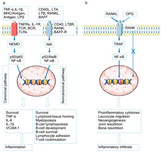 Schematic representation of the activation of signaling pathways and their influence on the pathogenesis of OA and RA. (a) Canonical and non-canonical activation of NF-κB signaling pathway. In canonical NEMO-dependent activation, the dimer regulating transcription—p50/p65. In non-canonical NIK-dependent activation, the dimer—p52/RelB. (b) Activation of the RANKL/RANK/OPG pathway. RANKL binds to RANK as its receptor and eventually leads to osteoclast precursor maturation. OPG is known as a decoy receptor for RANKL that prevents RANKL-RANK binding and the subsequent reactions. Osteoarthritis (OA); rheumatoid arthritis (RA); nuclear factor κB (NF-κB); NF-κB essential modulator (NEMO); NF-κB-inducing kinase (NIK); receptor activator for nuclear factor κB ligand (RANKL); receptor activator for nuclear factor κB (RANK); osteoprotegerin (OPG); tumor necrosis factor (TNF); TNF receptor-associated factor (TRAF); major histocompatibility complex (MHC); interleukin 1 beta (IL-1b); lipopolysaccharide (LPS); cluster of differentiation 40/cluster of differentiation 40 ligand (CD40/CD40L); lymphotoxins alpha and beta (LTA/LTB); lymphotoxin beta receptor (LTBR); B-cell activating factor receptor (BAFFR); B-cell activating factor (BAFF); interleukin 6 (IL-6); vascular cell adhesion molecule 1 (VCAM-1). The information about signaling pathways was obtained from Kyoto Encyclopedia of Genes and Genomes (KEGG).