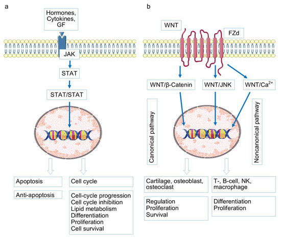 Schematic representation of the activation of signaling pathways and their influence on the pathogenesis of OA and RA. (a) Activation of the JAK/STAT pathway. JAK/STAT signaling involves three main proteins: cell surface receptors, JAKs, and STATs. After a ligand binds to a receptor, JAKs phosphorylate the receptor. This attracts STAT proteins, which are also phosphorylated and bind to form a dimer. The dimer translocates into the nucleus, binds to DNA, and induces gene transcription. (b) Activation of Wnt signaling pathways: the canonical Wnt pathway, the non-canonical planar cell polarity pathway, and the non-canonical Wnt/calcium pathway. All pathways are activated by binding of a Wnt protein ligand to a receptor of the Frizzled family. The canonical pathway involves the protein beta-catenin, while the non-canonical pathways act independently. Janus kinase (JAK); signal transducer and activator of transcription (STAT); growth factor (GF); Wnt family member (Wnt); Frizzled family receptor (FZd); c-Jun N-terminal kinases (JNK); natural killer (NK). The information about signaling pathways was obtained from Kyoto Encyclopedia of Genes and Genomes (KEGG).