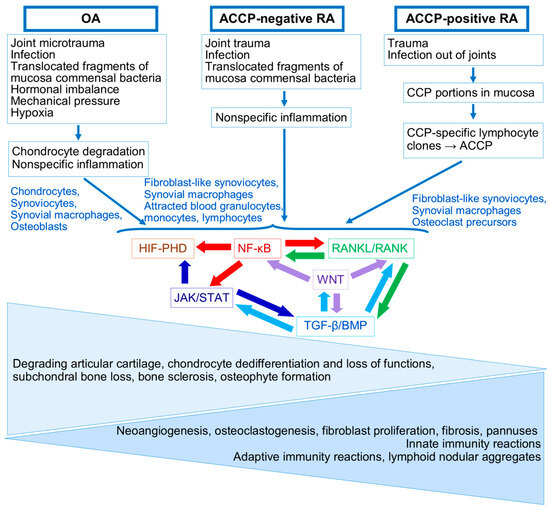 As reported in other multifactorial diseases, both RA and OA are provoked by interaction of external factors with the unique genetic features of the diseases. As it was mentioned above, there are two well-identified RA variants—ACCP-positive and ACCP-negative—with the discussion below focusing on some essential differences of their genetic backgrounds and early-stage pathogenic mechanisms, while OA variants are currently discussed mainly at the level of analyzing clinical data and developing therapy without depending on the differences in the intimate pathogenic mechanisms, which are now beginning to be intensively studied [108,109,110].