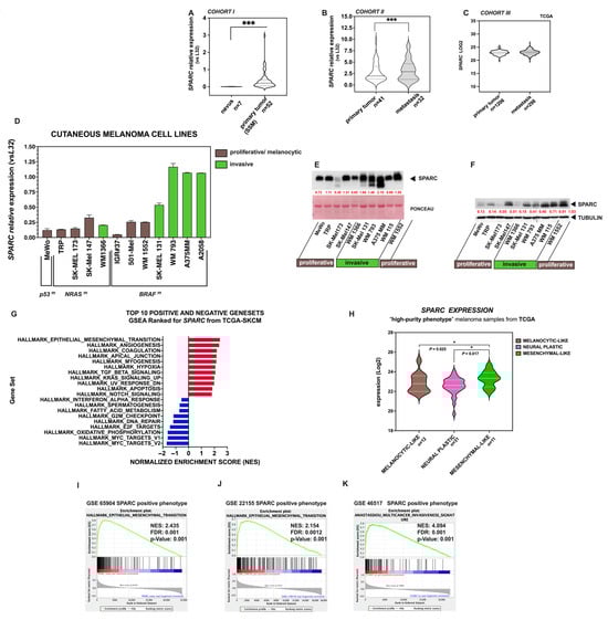 Expression of SPARC in human melanoma samples and cell lines. Violin plots depicting the expression of SPARC mRNA levels in (A) benign nevi and primary melanoma samples SSM (Cohort I); (B) in primary tumors and metastases from advanced melanoma samples (Cohort II); (C) in primary tumors and metastases from the SKCM-TCGA dataset (Cohort III). p-values were calculated using the Mann–Whitney test: p < 0.01 is indicated by *** in panels A,B; (D) SPARC mRNA levels in melanoma cell lines growing in vitro, measured by qRT-PCR and normalized to the RPL32 gene. (E) Western blot of secreted SPARC in the conditioned media of cell lines (upper panel) and Ponceau S staining as a control of loading in the bottom panel. (F) Western blot of SPARC in whole cell extracts of melanoma cell lines. Red values indicate relative expression levels determined by densitometric analysis normalized to α-Tubulin signal intensity. (G) Single Sample Gene Set Enrichment Analysis (ssGSEA) for SPARC (high/low SPARC expression) in primary tumors and metastases from the TCGA-SKCM dataset; Bar charts show the most significantly enriched gene sets by their Normalized Enrichment Score (NES), positively correlated (in red) and negatively correlated (in blue), according to the FDR (False-Discovery Rate). The Epithelial–Mesenchymal Transition (EMT) signature was the first in the Top 10 positive gene sets; The presence of SPARC is indicated (SPARC ranking score). (H) Violin plot depicting the expression level of SPARC in melanocytic-like, neural plastic, and mesenchymal-like, high-purity phenotypes from TCGA-SKCM melanoma samples according to Andrews et al. []. Statistical significance is indicated by *, and p values are shown. (I–K) Positive association between SPARC and EMT, as demonstrated by GSEA, in independent GSEs (GSE65904, GSE22155, and GSE4617 datasets). A t-test was used to compare two situations, and statistical significance was considered as p < 0.05. Genes were ranked based on their Pearson correlation with SPARC. The NES, FDR, and p are indicated in all GSEA plots.