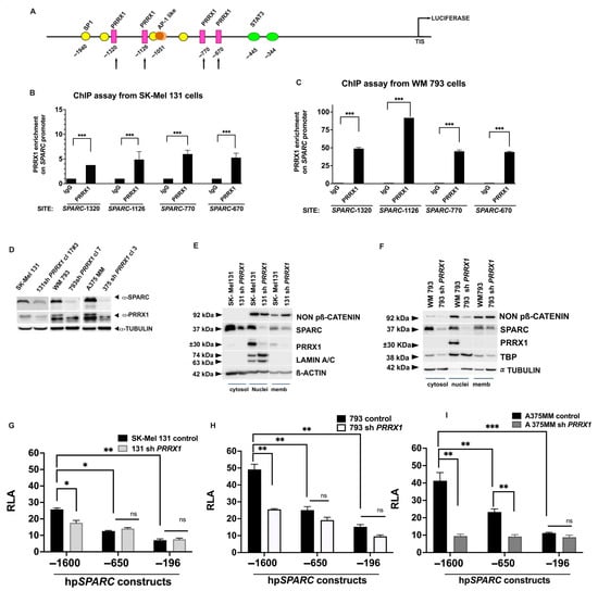 PRRX1 activates SPARC transcription in human melanoma cells. (A) Diagram showing the four putative PRRX1-binding sites at the distal SPARC promoter (indicated by arrows). Potential Sp1 sites and the AP-1-like site in this region are also indicated. (B,C) ChIP-qPCR analysis demonstrating PRRX1 binding to the SPARC promoter in SK-Mel 131 and WM 793 cells. Bars in the box plot show the enrichment at each binding site relative to an IgG control. Error bars are ± S.E.M. p-values were determined using Student’s t-Test (*** p < 0.001). Primer sequences used here are detailed in Supplementary Table S4. Here, one representative of three independent experiments is shown. (D) Detection of PRRX1 and SPARC in previously characterized PRRX1-silenced cells [] by immunoblot. Control cells were infected with the pLKO.1 vector. One representative immunoblot of three independent experiments is shown. α-Tubulin was used as a loading control. (E,F) Protein levels of non-phospho β-catenin, PRRX1, and SPARC were analyzed in the subcellular fractions of SK-Mel 131- and WM 793-PRRX1-knockout cells and their controls by immunoblot. (G–I) SPARC promoter activity in SK-Mel 131-, WM 793-, and A 375MM-PRRX1-knockout cells and their controls. The RLA of the three constructs (hpSPARC-1600 luc, hpSPARC-650 luc, and hpSPARC-196 luc) was calculated relative to that of the promoter less control. Results represent the mean ± S.E.M. of three independent experiments performed in duplicate. Statistical significance was calculated by Student’s t-test (* p < 0.05; ** p < 0.01; *** p < 0.001); ns indicates non statistical significance.
