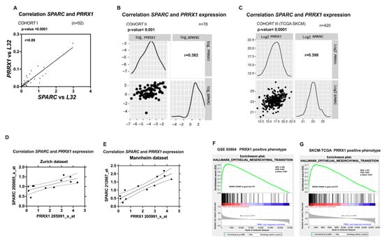 Moreover, the gene expression of SPARC was found to be positively correlated with that of PRRX1 in the Zurich and Mannheim datasets from Hoek [] (Figure 4D,E). In agreement with the above results, the GSEA in GSE65904 and TCGA-SKCM datasets confirmed the significance of SPARC co-expression with the PRRX1-positive phenotype (Figure 4F,G).