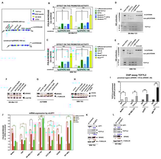 SPARC expression in melanoma cells is mediated by Wnt signaling activation and binding of TCF7L2 to the SPARC promoter. (A) Schematic representation of the constructs hpSPARC-650luc and hpSPARC-196luc of the proximal region of SPARC promoter driving the luciferase reporter, as described in Section 4. The putative binding sites of regulatory elements and their position relative to TIS are indicated. (B,C) Bars in the box plots show the increase over the control caused by Wnt effectors on the SPARC promoter activity. SK-Mel 131 (B), WM 793 cells (C). Here is shown the mean ± S.E.M. of technical triplicates. Statistical significance was analyzed using Student’s t-test, * p < 0.05; ** p < 0.01; *** p < 0.001. One representative of three independent experiments is shown. (D,E) Whole-cell lysates of SK-Mel 131 (D) and WM 793 (E) cells were subjected to immunoprecipitation with either anti-TCF7L2 or anti-β-catenin antibodies, followed by Western blot to analyze protein–protein interactions. (F–H) Effect of Wnt/β-catenin signaling inhibitors on the expression of SPARC in melanoma cells: SK-Mel 131 (F), A375 MM (G), and WM793 cells (H). Cell lysates were obtained from treated cells with the indicated inhibitors or vehicle and then were subjected to Western blot analysis and probed with an anti SPARC antibody. Specific signals were quantified by densitometry and normalized by those of β-actin or α-Tubulin. In red is shown the levels of SPARC expression upon the treatment with inhibitors relative to controls. Here is shown one of three independent experiments. (I) Chromatin immunoprecipitation (ChIP assay) showing TCF7L2 binding to the SPARC proximal promoter in MeWo, SK-Mel 131, A2058, and WM 793 melanoma cells. Box plots show the enrichment of TCF7L2 relative to IgG controls. The dotted line indicates no enrichment over an IgG control. p-value was determined using an unpaired two-sided t-test (** p < 0.05, *** p < 0.01). (J) Diagram showing the expression of SPARC, TCF7L2, Wnt5a, and MITF caused by the transitory knockdown of LEF1. Gene expression was analyzed by qRT-PCR 60 h after transfection with siLEF1 or scrambled siRNA (control). Bars represent the mean ± S.E.M. of fold-increase over their respective controls. Treatments were performed in duplicate. One representative of five experiments is shown. p-value was determined using an unpaired two-sided t-test (* p < 0.05; ** p < 0.01; *** p < 0.001). (K,L) Assessment of SPARC protein expression in WM 793 and 501-Mel melanoma cells after siLEF1 treatment. The whole-cell lysates were collected after siRNA treatment, as described above, and subjected to Western blot. Anti-LEF1, anti-TCFL2, and anti-SPARC antibodies were used to reveal their expression and anti-α-Tubulin as loading control. The relative expression was quantified by densitometric analysis. In color is shown the levels of expression relative to controls.