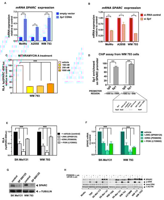 Sp1 expression and MAPK signaling pathways control the activity of the SPARC proximal promoter and protein expression. (A,B) Box plots of SPARC mRNA expression in MeWo, A2058, and A375 MM cells transiently transfected with either wild type Sp1 expression vector or empty vector (A). In (B) cells were transfected with either Sp1 siRNA or non-targeting (scrambled) siRNA control. Transient transfections and siRNA experiments were performed as described in Section 4. SPARC mRNA levels were measured after 60 h by qRT-PCR and normalized to RPL32 expression. The height of bars represents the mean and standard deviation, (SD) from three independent experiments with technical duplicates. Student’s t-distribution was used for statistical analysis (* p < 0.05; ** p < 0.01; *** p < 0.001). (C) Box plot showing the effect of Mithramycin A on SPARC promoter activity. Briefly, WM 793 cells were transiently transfected with the hpSPARC-650 luc construct, and 8 h later were treated with Mithramycin A for 24 h at the indicated final concentrations. Results show the RLA of doses relative to the vehicle-treated control. Results represent the mean ± S.E.M. of three independent experiments performed in duplicate transfections. Statistical significance was calculated with Student’s t-test, *** p < 0.001. (D) Box plot of Sp1 enrichment on SPARC, covering regions −1500 to −1065 and −1065 to −640 nt of the promoter (upper panel). Bars in the box plot show the enrichment over the IgG controls. Error bars are ± S.E.M. p-values were determined using Student’s t-Test (*** p < 0.001). Here, one of three independent experiments is shown. The bottom panel shows one example of the PCR products after amplification of the region from −1065 to −640 of the SPARC promoter. PCR products were resolved in 6% polyacrylamide gel electrophoresis and visualized by staining with ethidium bromide (EtBr). (E) Box plot showing the effect of JNK, ERK, and PI3K inhibitors on the activity of the SPARC promoter. (F) SPARC mRNA in SK-Mel 131 and WM 793 cells after the treatment with these inhibitors. Experimental procedures and statistical analyses were performed as described above. Statistical significance was calculated with Student’s t-test, *** p < 0.001. (G) Representative immunoblots of SPARC in SK-Mel 131 and WM 793 cells treated with the JNK inhibitor SP600125. (H) Representative immunoblots detecting SPARC and ERK proteins in several melanoma cell lines treated with MEK inhibitor (UO126), ERK inhibitor (PD98059), or vehicle. a-Tubulin was used as a loading control.
