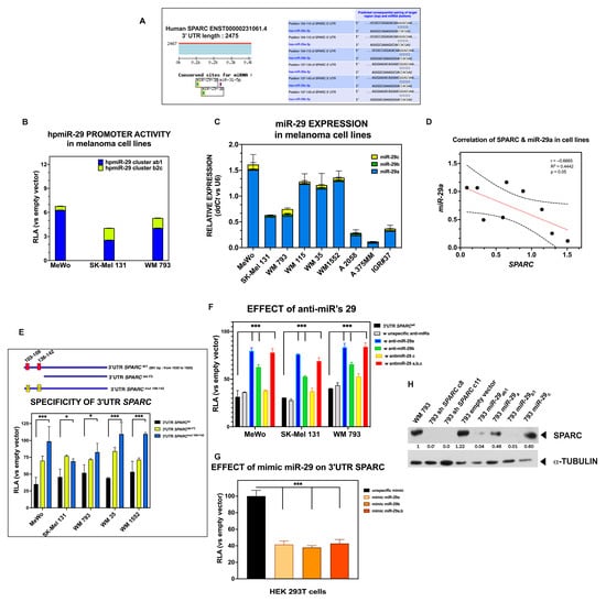 To examine the presence of miR-29s and regulatory function of miR-29 family members in human melanoma cells, we first analyzed the activity of their respective promoters. The three members of the miR-29 family, miR-29a, miR-29b, and miR-29c, although sharing the same seed sequence, are located on two different genomic clusters: one in chromosome 7 (containing miR-29a and miR-29b1), and the other on chromosome 1 (containing miR-29c and miR-29b2). As shown in Figure 7B, the basal activation of both promoters—hpmiR-29 cluster a,b-1 and hpmiR-29 cluster b-2c—was observed in these three melanoma cell lines, albeit at different intensities. We subsequently analyzed the expression of these miR-29s in different melanoma cell lines and found that they were always present, although at varying levels (Figure 7C). Remarkably, miR-29a was the most abundantly expressed family member, likely occurring in other cancer types []. Since the cell lines expressed SPARC (as shown in the previous part of this study), we analyzed the possible correlation between the two variables. Figure 7D shows that SPARC expression levels are negatively correlated with those of miR-29a, reaching statistical significance (p = 0.05, calculated using Pearson’s correlation test).