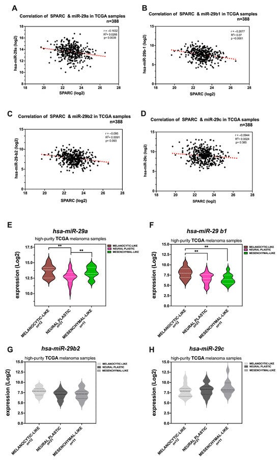 Expression of miR-29s in human melanoma samples from the TCGA-SKCM dataset. (A–D) Scatter plots showing the inverse correlation between SPARC and miR-29 expression in TCGA melanomas. The Pearson correlation coefficient (PCC) and corresponding p-values are shown. Statistical significance was found between SPARC and either miR-29a or miR-29-b1 ((A,B), respectively) but was not statistically significant between miR-29b2 or miR-29c and SPARC (C,D). (E–H) Violin plots depicting the expression levels of miR-29 in the TCGA-SKCM dataset. Values of each miR-29 corresponding to the three phenotypes (melanocytic-like, neural plastic, and mesenchymal-like) selected by Andrews et al. as “High-purity metastatic TCGA melanoma samples” [] are shown. (E) Statistical significance for hsa-miR-29a expression was found between the phenotypes was calculated using the Mann–Whitney test: ** p = 0.03 melanocyte-like compared with neural plastic, and ** p = 0.04 neural plastic compared with mesenchymal-like. (F) Similarly, statistical significance for hsa-miR-29b1 expression was found between the phenotypes; ** p = 0.014 melanocyte-like compared with neural plastic; ** p = 0.012 melanocyte-like compared with mesenchymal-like. (G,H) Non-significant differences between the phenotypes were detected for hsa-miR-29b2 and hsa-miR-29c (green violins).