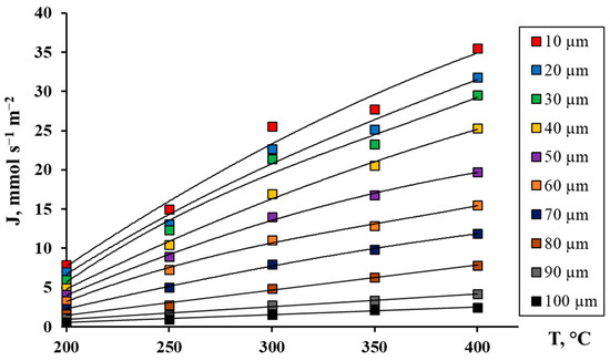 The developed Pd-Ag-Ru alloy foils of different thicknesses from 10 to 100 μm were investigated as membranes in hydrogen transfer processes in the temperature range from 200 to 400 °C. The choice of this temperature range is due to its proximity to the actual operating mode of the membranes in a steam reforming reactor of alcohols [30]. The membranes were tested for hydrogen permeability in the temperature range of 200–400 °C at an excess pressure of 0.3 MPa using the method described in Section 3.3. The obtained data, presented in Figure 2, demonstrated a clearly expressed inverse dependence of the hydrogen flux density on the membrane thickness in the entire studied temperature range. This dependence is well described by the classical equation of diffusion through a dense metal membrane (Sievert–Fick law) [57]: