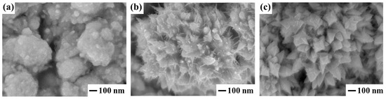 The surface of the studied Pd-Ag-Ru foils was activated by applying a nanostructured coating based on palladium particles. This approach is aimed at imparting specific properties to the material, in particular improved catalytic activity, selectivity and hydrogen permeability, which are necessary to improve the characteristics of hydrogen-permeable membranes. The study included synthesis and comparative analysis of three different types of nanoparticles that form modifying coatings. Additional tools for adjusting the shaping (surfactant, deposition current) allowed for a systematic change in the particle shape from spherical to spiky and pyramidal. SEM images of typical representatives of each particle type are shown in Figure 3. The key aspect of the study was strict control of the dimensional parameters of the synthesized nanoparticles in the coatings. All three types of particles were obtained with a similar average size in the range of about 90–110 nm. Such strict control of the particle size in the modifying coatings was used to minimize the influence of the size factor and reliably assess the influence of the morphology factor alone on the key studied properties and characteristics of the materials.