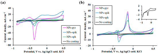The obtained results can be assessed by three main parameters: (i) the anodic peak current density during forward scanning; (ii) the initial oxidation potential of methanol; (iii) the tolerance coefficient to intermediate poisoning (Table 1). The obtained experimental data revealed a significant dependence of the peak current density on the surface morphology of the studied electrodes, reflected in the following series: NPs-pyr > NPs-spik > NPs-sph >> uncoated. The peak current density values for the electrode with NPs-pyr (up to 38 mA cm−2) turned out to be up to 1.6 times higher than for the electrode with NPs-sph, and more than an order of magnitude higher compared to the electrode without a coating. For all electrodes the initial potential was in the negative potential region. This result indicates a decrease in the energy barrier for initiation of the methanol oxidation reaction, easier adsorption and activation of methanol molecules on the modified surface, and an increased ability to remove intermediates at early oxidation stages [73]. Accordingly, more positive values of the initial oxidation potential indicate hindered methanol adsorption and/or a strong inhibitory effect of COads, which leads to a decrease in the peak current density in a given potential region (−0.9 V–+0.5 V). The tolerance coefficient k was estimated through the ratio of the peak current density during forward (If) and reverse (Ib) scanning [74]. High values of the If/Ib ratio achieved for electrodes indicate efficient methanol oxidation during forward scanning, relatively low accumulation of poisoning intermediates COads by the time of reverse scanning, as well as high efficiency of COads oxidation during reverse scanning. This result indicates an increased resistance of the modifying nanostructured coatings to poisoning.