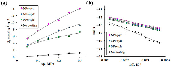 The second series of tests investigated the dependence of the hydrogen flux on temperature in the range from 25 to 200 °C at a fixed overpressure of 0.3 MPa (Figure 5b). According to the data obtained, the membrane with NPs-pyr demonstrated hydrogen flux values up to 41 mmol s−1 m−2 at 200 °C, which was up to 7 times higher than the values for uncoated membranes. Calculation of the activation energy (Ea) confirmed the effect of membrane surface modification and coating morphology on the rate-limiting steps of hydrogen transport. Thus, the minimum Ea value was obtained for membranes with NPs-pyr (27 kJ mol−1), while for uncoated membranes Ea was significantly higher (42 kJ mol−1) (Table 2). It is known from the literature that Ea values below 30 indicate a significant contribution of diffusion to the hydrogen transfer process, while surface processes are characterized by significantly higher Ea values [42]. The changes in the activation energy for the membranes under study are reflected by the following series: NPs-pyr < NPs-spik < NPs-sph < uncoated. Thus, the established dependence between Ea and ECSA proves that a significant contribution to the acceleration of hydrogen transport is made not only from increase in surface roughness, but also by the creation of a special morphology of the coatings. Thus, the application of coatings with NPs-pyr, which have a high concentration of surface active centers, contributed to a decrease in the activation energy of sorption/desorption, which ensured the transition from complete limitation by the surface to predominant limitation by diffusion control.