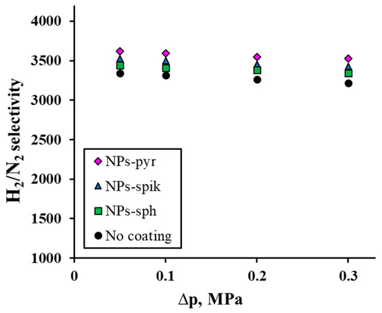 The third series of tests allowed us to evaluate the selectivity of the developed Pd-Ag-Ru membranes, determined through the H2/N2 flux ratio. The obtained data on the pressure dependence of the H2/N2 selectivity (0.1–0.3 MPa), shown in Figure 6, demonstrate a very weak inverse relationship: at the maximum pressure (0.3 MPa), the H2/N2 selectivity value decreases by only 3% relative to the values at the minimum pressure. The highest selectivity value was achieved for membranes with NPs-pyr—3621 at 0.3 MPa. An important observation is the increase in the values for membranes with a modified surface compared to the uncoated membrane. It should be noted that the dependence of the selectivity increase fully correlates with the previously described dependence of the flux density increase on pressure. This result corresponds to the model of competing mechanisms, where the dominant contribution to hydrogen transfer through the membrane is made by the dissolution–diffusion mechanism, while for nitrogen the Knudsen flux through subnanometer defects is enhanced. It should be noted that the tests were carried out in several cycles, including to determine the mechanical stability of the membranes. No hysteresis was observed during the tests, which indicates the absence of significant defects in the manufactured membranes and the adhesive strength of the modifying coatings.