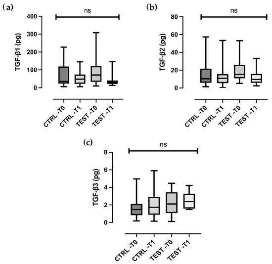 Box- and-whisker plots showing the total amount of (a) TGF-β1, (b) TGF-β2, (c) TGF-β3 in gingival crevicular fluid of the control and test groups at baseline (T0) and two weeks post-treatment (T1). The box represents median, 25% and 75% percentiles, the whiskers represent data within 10% and 90% percentiles. ns, not statistically significant.