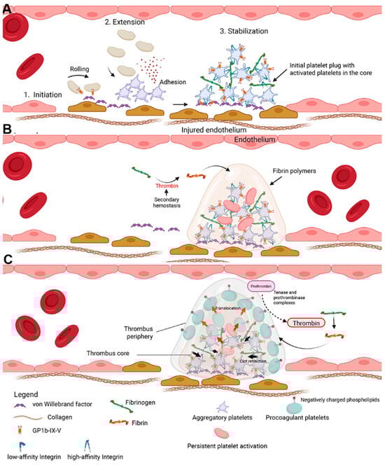 Overview of thrombus formation and composition. (A) Upon vascular injury, platelets undergo the three-stage model of platelet activation which involves platelet adhesion to subendothelial matrices and proteins such as collagen, extension (agonist release, shape change, and integrin (αIIbβ3) activation), and stabilization, which requires conformational changes in the integrin, αIIbβ3, and enabling platelets to aggregate by binding to ligands like fibrinogen. (B) The formed platelet aggregates during primary hemostasis enter its second phase during which the thrombus structure is further stabilized by the formation of fibrin polymers. Secondary hemostasis occurs on the membrane phospholipids that are exposed on the surface. Platelets are the primary phospholipid-exposing cells which provide a binding site for coagulation complexes assembly. These coagulation complexes, namely the tenase (factors VIIIa and IXa) and prothrombinase (factors Va and Xa), facilitate thrombin generation, which in turn cleaves fibrinogen to fibrin and leads to the formation of a stabilized fibrin clot. (C) Aggregatory platelets with their active αIIbβ3, form the majority of the thrombus core. As some platelets within the thrombus core are persistently activated due to exposure to agonists, they begin to adopt procoagulant platelet phenotypes characterized by high phosphatidylserine, a balloon shape, and loss of functional integrins. They are then translocated to the thrombus periphery (red arrows) due to clot refraction (black arrows). Highly exposed PS facilitates the binding of coagulation complexes to facilitate more thrombin generation and fibrin deposition to fortify the overall structure of the clot.