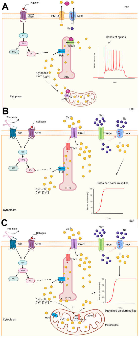 Calcium signaling in procoagulant platelet formation. (A) Transient intracellular calcium signaling. IP3 binding to its receptor, IP3R, on the DTS, results in calcium influx into the cytosol. Three main mechanisms are responsible for the maintenance of oscillatory intracellular calcium [Cai] (1) [Cai] triggers sarcoendoplasmic calcium ATPase (SERCA) to actively pump [Cai] back into the DTS, (2) [Cai] is transported out of the cytosol via plasma membrane calcium ATPase pump (PMCA) and NCX located on the plasma membrane. (3) Additional [Cai] is stored within the mitochondria via MCU. This increase and decrease in [Cai] creates an oscillatory [Cai] pattern. (B) Sustained increase in [Cai] is achieved via activation in response to platelet agonists such as thrombin and collagen. A sustained increase in [Cai] is required for procoagulant platelet formation. This is achieved via calcium entry through plasma membrane in a process called SOCE. STIM1 is located on the DTS and is a regulator of ORAI1, the main channel involved in SOCE. STIM1 detects calcium depletion in the DTS and cytosol and signals ORAI1 to facilitate calcium entry into the cytosol from the extracellular space. TRPC6 allows sodium entry into the cytosol, which increases intracellular sodium concentration and reverses NCX to drive more calcium entry in exchange for intracellular sodium. (C) Electrochemical difference across the inner mitochondrial membrane drives calcium entry into the mitochondria via MCU. A marked increase in mitochondrial calcium concentration is sensed by cyclophilin D (CypD), which sets the threshold of of mitochondrial permeability transition pore (mPTP) opening. When the increase in calcium concentration reaches a certain threshold, mPTP allows vast amounts of calcium to enter the cytosol, creating a supramaximal calcium concentration. This is followed by activation of scramblase, TMEM16F, and the subsequent flipping of PS from the inner leaflet of the plasma membrane to the outer leaflet of the phospholipid bilayer. PAR4, protease-activated receptor 4; DAG, diacylglycerol; rNCX, reversed sodium-calciumsodium–calcium exchanger.