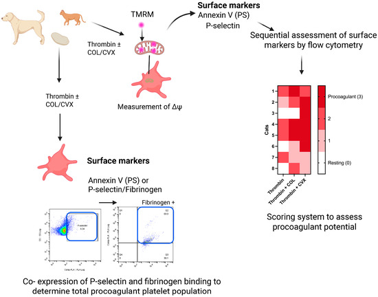 Given the species differences in platelet response to agonists, investigators are encouraged to conduct dose response testing. In cats and dogs, the authors have been successful in inducing procoagulant phenotypes by stimulating platelets with thrombin in the presence of GPVI agonists, collagen, and convulxin. When simultaneous detection of surface markers is not possible, a scoring system, similar to the one we devised, can be used to evaluate the procoagulant tendency of platelets in individual animals. Response of each marker was scored according to an arbitrary cut-off established in platelets treated with thrombin and collagen or convulxin on flow cytometry. The scores for each marker were then tabulated to yield a total procoagulant tendency score in each individual animal (Figure 3). Overall, thrombin and convulxin were the most potent combination of agonists in inducing a procoagulant phenotype followed by collagen in feline platelets [46]. In dogs, washed gel-filtered platelets were standardized in calcium containing buffer with 10% canine plasma and conjugated human fibrinogen. Platelets were then treated with activators including thrombin, GPVI agonists, and neutrophil supernatant for a short period of time before codetection of P-selectin and fibrinogen binding (Figure 3) [70].