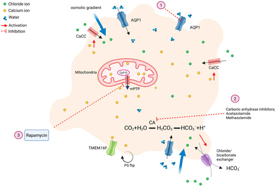 Potential therapeutic targets to block procoagulant platelet formation. Binding of strong agonists such as thrombin and collagen to their receptors initiates a downstream cascade of events leading to an initial increase in intracellular calcium. This calcium elevation activates CaCC, which promotes water entry via AQP1 by osmotic gradient generated by increased chloride ions. (1) AQP1 inhibition diminishes platelet spreading and thrombus formation. Chloride ions also enter the cytoplasm through chloride/bicarbonate antiporter. Export of bicarbonate is facilitated via carbonic anhydrase, which catalyzes the conversion of carbon dioxide (CO2) and water (H2O) to carbonic acid, bicarbonate, and protons. (2) CA inhibitors such as acetazolamide and methazolamide block CA to modulate procoagulant platelet generation. (3) Rapamycin may reduce procoagulant platelet generation by preserving the mitochondria membrane potential.