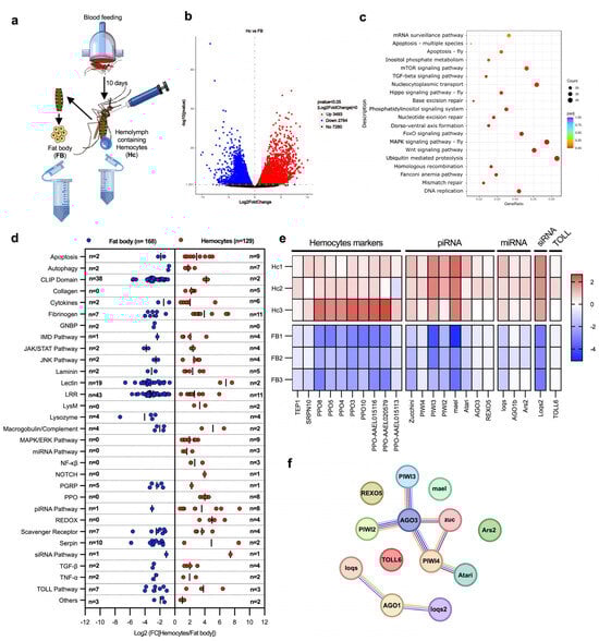 Transcriptomic analysis of immunity-related genes in the fat body and hemocytes. (a) Experimental design for comparing fat body and hemocyte transcriptomic profiles. Fat body cells and hemolymph from 150 female mosquitoes (per replicate) were collected at 10 days post-blood feeding to analyze their transcriptomes. (b) Volcano plot of differentially expressed genes on hemocytes (p < 0.05). Dots in blue indicate downregulated genes in hemocytes (which are highly expressed in the fat body); dots in red show upregulated genes in hemocytes; black dots indicate non-differentially expressed genes. The X-axis indicates the Log2 of fold change, and the Y-axis indicates the -Log10 of p-value. (c) Scatter plot of KEEG pathway enrichment of highly expressed genes in hemocytes. The circle area indicates the number of upregulated genes in hemocytes; the color scale indicates the adjusted p-value. X-axis indicates gene ratio (count of core enrichment genes/count of pathway genes). (d) Scatter plot of immune genes classified by pathways and families. Blue dots indicate highly enriched gene mRNAs in the fat body (with lower expression in hemocytes); red dots denote highly expressed gene mRNAs in hemocytes (lower expression in the fat body). The X-axis indicates the Log2 fold change [Hemocytes/Fat body]. The number of genes is indicated on Y-axis as “n =”. (e) Heat map of Z-score values of hemocyte marker genes and antiviral immune genes. The red color indicates upregulated genes in hemocytes; the blue color shows downregulated genes. The heat map presents the values of each replicate of hemocytes (Hc1-3) and fat body (FB1-3) samples. (f) String protein–protein interaction analysis of antiviral genes highly expressed in hemocytes. Each circle represents a protein, and each line represents an interaction (physical or functional). All data were obtained from three biological replicates. Differentially expressed genes were determinate using DESeq2 package; the p-values were adjusted by Benjamini and Hochberg’s test, p ≤ 0.05 were assigned as differentially expressed. (a) was created by Victor Cardoso-Jaime in Microsoft PowerPoint Version 16.92.