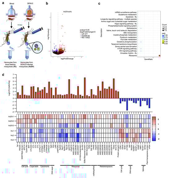 Transcriptomic analysis of hemocytes from dengue virus-infected mosquitoes. (a) Experimental strategy for transcriptomic analysis of hemocytes. Comparison of transcriptomic profiles in hemocytes from DENV-infected mosquitoes was performed 10 days post-infection, using hemocytes from blood-fed mosquitoes as controls. (b) Volcano plot of differentially expressed genes in hemocytes from DENV-infected mosquitoes. The blue dots represent genes that are downregulated, and red dots denote genes that are upregulated in the hemocytes of DENV-infected mosquitoes. The X-axis indicates the Log2 of fold change, and the Y-axis indicates the -Log10 of p-value. (c) Scatter plot of KEEG pathway enrichment of upregulated genes in hemocytes of DENV-infected mosquitoes. The circle areas indicate the number of upregulated genes; the color scale indicates the adjusted p-value; X-axis indicates gene ratio (count of core enrichment genes/count of pathway genes). (d) Log2 of -fold change values, and z-score heat map of differentially expressed genes in the hemocytes of DENV-infected mosquitoes. The red color indicates upregulated genes in hemocytes, and the blue color represents downregulated genes. The heat map presents the values of each replicate of hemocytes from DENV-infected (HcDV1-3) and naive (Hc1-3) mosquitoes. All data were obtained from three biological replicates. Each experiment was performed using samples from 150 female mosquitoes. Differentially expressed genes were determined using DESeq2 package; the p-values were adjusted by Benjamini and Hochberg’s test, p ≤ 0.05 were assigned as differentially expressed. (a) was created by Victor Cardoso-Jaime in Microsoft PowerPoint Version 16.92.