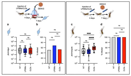 Effect of phagocytic hemocyte depletion in dengue virus infection. (a,b) Non-treated [NT], control liposome-injected [LPSMs], and clodrosome-injected [CLDs] mosquitoes were fed on blood containing DENV, and then the viral load (a) and prevalence (b) were evaluated in the midgut at 7 days post-infection. (a,b) n= 57 (NT), n= 63 (LPSMs), n= 62 (CLDs). (c,d) NT, LPSMs, and CLDs mosquitoes were infected by directly injecting the same number of viral particles into the hemocoel. Viral titer (c) and prevalence (d) were then evaluated in the whole mosquitoes at 7 days post-infection. (c,d) n= 48 (NT), n = 48 (LPSMs), n = 48 (CLDs). Viral titers are expressed as a median with a min. to max. of plaque-forming units (PFUs), represented in a box and whiskers graph, where each dot represents an individual sample (midgut or whole mosquito). Statistical differences in viral titers between groups were analyzed using a Kruskal–Wallis test, followed by a Dunn’s multiple comparation test. Prevalence values are expressed as percentages in a bar graph. Statistical analysis of prevalence was performed using a two-sided Fisher’s exact test. *** p = 0.0001; **** p < 0.0001; ns, not significant. Experimental strategy diagrams were created by Victor Cardoso-Jaime in Microsoft PowerPoint Version 16.92.