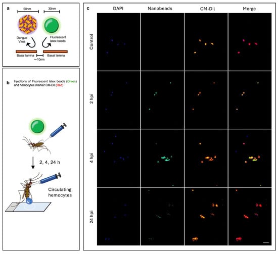 Analysis of hemocyte capacity to take up nanobeads. (a) Experimental strategy: the basal lamina of tissues are permeable to particles smaller than 10 nm, while DENV and nanobeads are bigger than 10 nm, meaning that the tissues cannot take up nanobeads and viruses, except in the case of cells lacking a basal lamina, such as hemocytes. (b) Mosquitoes were injected with fluorescent nanobeads 30 nm sized, and then hemolymph was perfused to collect the hemocytes at 2, 4, and 24 h post-injection. (c) Images at 2, 4, and 24 h post-injection of hemocytes from mosquitoes injected with nanobeads; hemocytes from mosquitoes injected with the vehicle were used as controls. In blue, the nuclei of cells stained with DAPI; green, 30 nm fluorescent nanobeads; red, CM-Dil (a hemocyte-specific dye); scale bar = 20 μm. Images are representative of three biological replicates (original images (Raw Images) of replicates, Supplementary Materials). Experimental strategy diagrams were created by Victor Cardoso-Jaime in Microsoft PowerPoint Version 16.92.