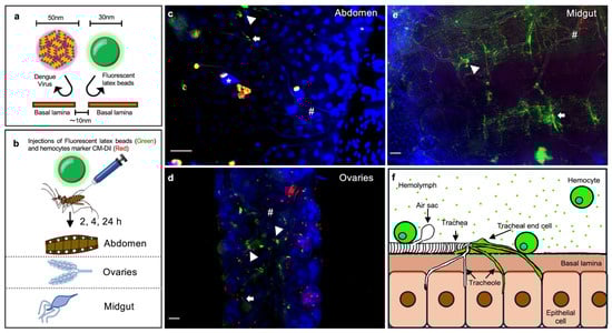 Permeability of mosquito tissues to virus-sized nanobeads. (a) Experimental strategy for assessing tissue permeability to viruses. Epithelial tissues are surrounded by basal lamina permeable to particles smaller than 10 nm; the diameter of DENV is 50 nm, and the size of the similarly sized, virus-mimicking fluorescent nanobeads used is 30 nm. (b) Mosquitoes were injected with nanobeads, and next tissues were dissected at 2, 4, and 24 h post-injection (all time points are shown in Supplementary Figures S3–S5). (c–e) Representative images of the distribution of fluorescent nanobeads and hemocytes in the abdomen (c), ovaries (d), and midgut (e) at 4 h post-injection. Blue, nuclei stained with DAPI; red, hemocytes stained with CM-Dil; green, 30 nm fluorescent nanobeads; *, air sacs; #, trachea; arrowhead, tracheal end cells; arrows, tracheoles; bar = 25 μm. (f) Model depicting the permeability of epithelial tissues to virus-sized nanobeads. Nanobeads are absorbed by the tracheal end cells, which are located at the ends of the tracheal branches where the tracheoles converge. Circulating and sessile hemocytes also acquire nanobeads. Images are representative of three independent biological replicates (original Images (Raw Images) of replicates, Supplementary Materials). (a,b,f) were created by Victor Cardoso-Jaime in Microsoft PowerPoint Version 16.92.