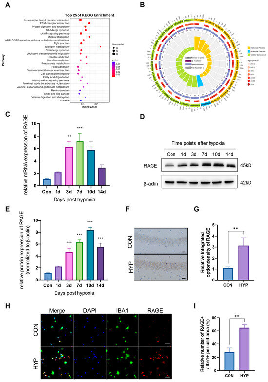 The effects of HAHH exposome on RAGE expression in the mouse hippocampus. (A) KEGG enrichment analysis of differentially expressed genes in the hippocampus after HAHH exposome. (B) GO enrichment analysis of differentially expressed genes in the hippocampus after HAHH exposome. (C) qPCR analysis of RAGE mRNA levels in the hippocampus of mice exposed to HAHH over time. Data are presented as fold changes relative to normoxic controls. n = 3, analyzed by Student’s t-test for two-group comparisons. (D) WB analysis of RAGE protein expression in the hippocampus of mice exposed to HAHH over time. (E) Quantitative analysis of RAGE protein expression in the hippocampus of mice exposed to HAHH over time. Data are presented as relative densitometry units normalized to β-actin. n = 3, analyzed by Student’s t-test for two-group comparisons. (F) Representative images of immunohistochemical staining for RAGE in the hippocampus of mice after HAHH exposome. Scale bar = 50 μm. (G) Quantitative analysis of RAGE immunohistochemical staining in the hippocampus of mice after HAHH exposome, expressed as mean optical density. n = 3, analyzed by Student’s t-test for two-group comparisons. (H) Immunofluorescence confocal microscopy of primary microglia isolated from the hippocampus of HAHH-exposed mice with staining for RAGE (FITC-conjugated, green), IBA1 (Cy3-labeled, red) and DAPI for nuclei (blue). Scale bar = 20 μm. Data from n = 3/group, analyzed by Student’s t-test for two-group comparisons. (I) Quantitative analysis of RAGE-positive cells as a percentage of IBA1-positive microglia in the hippocampus of HAHH-exposed mice. n = 3, analyzed by Student’s t-test for two-group comparisons. ** p < 0.01, *** p < 0.001.