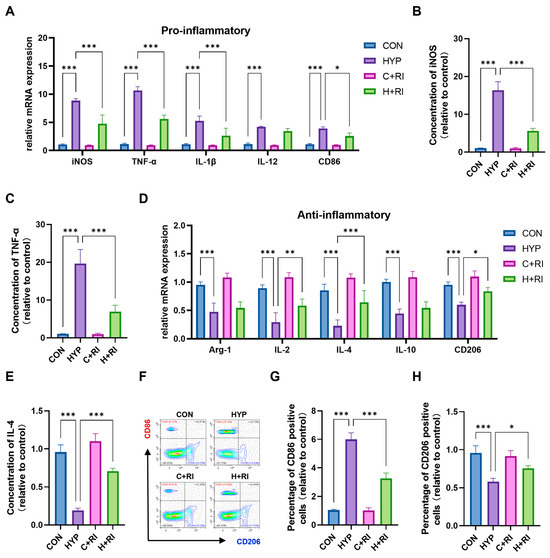 Effects of a RAGE inhibitor on HAHH-induced microglial inflammation. (A) qPCR analysis of pro-inflammatory markers (iNOS, TNF-α, IL-1β, IL-12, CD86) in microglial cells treated with RAGE inhibitor (FPS-ZM1) under hypoxic conditions. Data are presented as fold changes relative to normoxic controls. (B,C) ELISA analysis of iNOS and TNF-α levels in microglial cells treated with RAGE inhibitor under hypoxic conditions. (D) qPCR analysis of anti-inflammatory markers (Arg-1, IL-2, IL-4, IL-10, CD206) in microglial cells treated with RAGE inhibitor under hypoxic conditions. Data are presented as fold changes relative to normoxic controls. (E) ELISA analysis of IL-4 protein levels in microglial cells treated with RAGE inhibitor under hypoxic conditions. (F–H) Flow cytometry analysis of CD86-positive (red) and CD206-positive (blue) microglial cells in the hippocampus of mice treated with RAGE inhibitor under hypoxic conditions. Data are presented as fold changes relative to control group. n = 3, analyzed by one-way ANOVA with Tukey post hoc test for multiple comparisons. * p < 0.05, ** p < 0.01, *** p < 0.001.