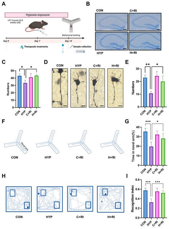 We first evaluated the effects of RAGE inhibition on hippocampal neurons. Nissl staining was performed on the hippocampus to assess neuronal numbers, and the data showed that the number of neurons was significantly restored in the RAGE inhibitor-treated group compared to the hypoxic group (Figure 3B,C). Golgi staining was performed on the hippocampus to assess synaptic changes, and the results showed that the RAGE inhibitor significantly restored the reduction in dendritic spine numbers caused by HAHH exposome (Figure 3D,E). To test whether RAGE inhibition is beneficial for improving cognitive impairment induced by HAHH exposome in mice, we established a HAHH-exposed mouse model and treated it with a RAGE inhibitor (RI group). To evaluate the effects of RAGE inhibition on cognitive and memory functions after HAHH exposome, we conducted Y-maze and novel object recognition tests (NORTs). The Y-maze test showed that the time spent exploring the novel arm was significantly shortened in the hypoxic group, while treatment with the RAGE inhibitor effectively improved the working memory impairment induced by HAHH exposome (Y-maze novel arm time: 28.08 ± 5.14 s vs. hypoxia 19.67 ± 4.68 s, p = 0.016) (Figure 3F,G). NORT data showed that the hypoxic group demonstrated preferential exploration of the novel object. Surprisingly, after treatment with the RAGE inhibitor, the recognition index and recognition time in the hypoxic group were almost reversed to normal levels (NORT recognition index: 0.52 ± 0.05 vs. hypoxia 0.33 ± 0.07, p < 0.001) (Figure 3H,I).