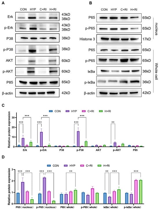 Next, we further explored the inflammatory molecular mechanisms of RAGE inhibition. RAGE triggers multiple downstream signaling cascades, notably the MAPK (ERK, p38, JNK) and PI3K/AKT pathways, whose activation promotes inflammatory reactions and oxidative stress, ultimately contributing to cellular and tissue injury. To assess the impact of RAGE inhibition on these pathways under hypoxic conditions, we measured the expression and phosphorylation levels of MAPKs (ERK, p38, JNK) and PI3K/AKT in the hippocampus of mice treated with the RAGE antagonist (Figure 4A). WB showed that the expression of p-ERK/P38/JNK and PI3K/AKT proteins was significantly increased in the hypoxic group by 9.1~15.2-fold compared to normoxic controls (CON; p < 0.01 to p < 0.001). However, the expression of p-ERK and p-p38 was significantly reduced by 81% and 49% when co-treated with the RAGE inhibitor relative to the HYP group (p < 0.01 to p < 0.001) (Figure 4C). The above data indicate that the MAPK pathway is involved in the protective effects of RAGE inhibitor, with ERK/P38 being the main signaling molecules. Compared to other receptor systems, RAGE exhibits unique Ras activation properties via MAPK signaling, thereby inhibiting the IκB cascade reaction and releasing and activating NF-κB. Therefore, we further detected the expression of NF-κB signaling pathway molecules at the protein level. Hypoxic conditions significantly elevated both IκBα and phosphorylated IκBα levels while increasing nuclear translocation of phosphorylated p65 (Figure 4B). However, when treated with FPS, the expression levels of p-IκBα and p-p65 in nuclear proteins were decreased, indicating reduced p65 nuclear translocation (Figure 4D). The above experiments confirm that the RAGE inhibitor inhibits microglial pro-inflammatory effects through the RAGE/MAPK/NF-κB pathway.