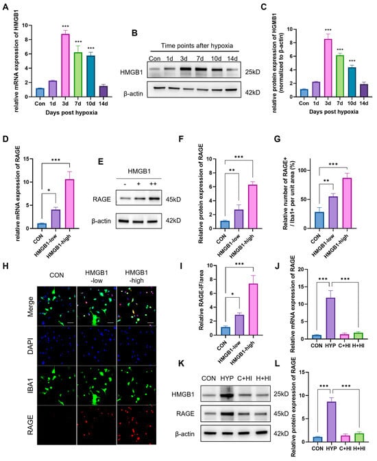 To verify that HMGB1 regulates RAGE expression, we first treated microglial cells with HMGB1 in vitro and then detected RAGE expression using PCR and WB. HMGB1 treatment of microglia in vitro upregulated RAGE transcription ~10-fold vs. untreated cells (PCR: p < 0.001) and ~6.2-fold at the protein level (WB: p < 0.001) with high HMGB1 concentration (5 μM) (Figure 5D–F). Immunocytochemical data showed that after in vitro treatment with HMGB1, the immunofluorescence intensity (IFI) of RAGE (~4.5-fold, p < 0.001) and the number of RAGE+ cells in microglia significantly increased (~7.5-fold, p < 0.001) (Figure 5G–I). Subsequently, we used glycyrrhizin (an HMGB1 inhibitor) in mice and detected RAGE expression in primary microglia in vivo. PCR and WB results showed that use of the HMGB1 inhibitor reduced HMGB1 mRNA by 90% vs. hypoxic controls (p < 0.001), downregulated RAGE transcripts by 85% (p < 0.001) and decreased HMGB1 and RAGE protein expression by 75% (p < 0.001) (Figure 5J–L). This further proved that HMGB1 regulates RAGE expression under hypoxic conditions.